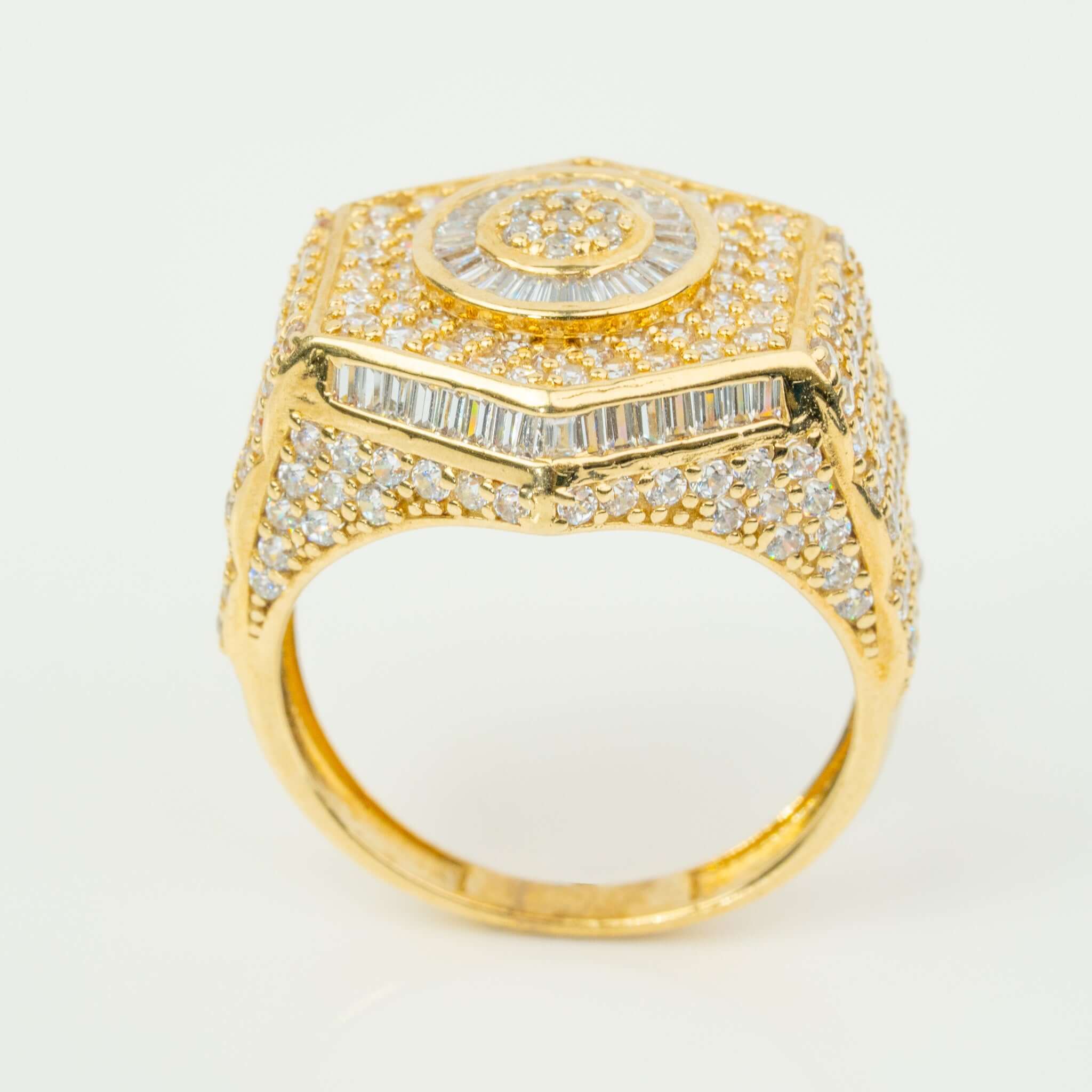 The 10K gold band lends strength and a deep gold color, making it perfect for everyday wear or on special occasions. Whether as an accessory to adorn oneself or as a gift to another person, this gold ring with CZ stones is surely made to impress and leave one's mark. Its lightweight and comfort fitting allow it to be easily worn while adding a touch of elegance to anything worn.