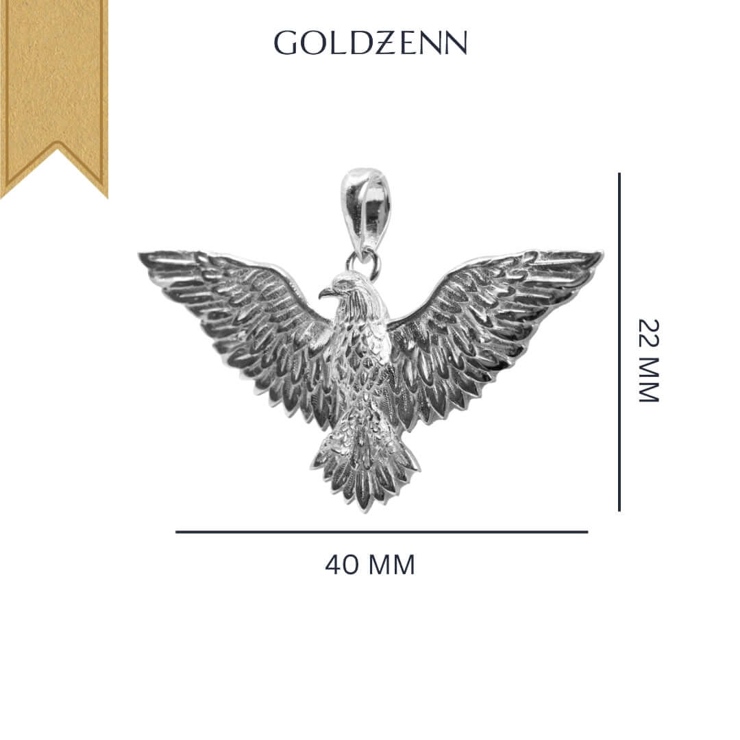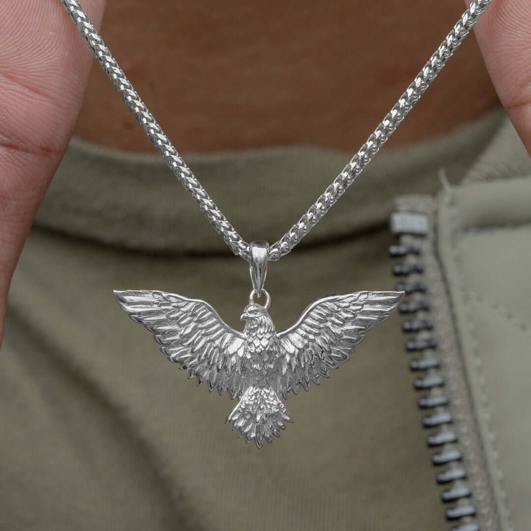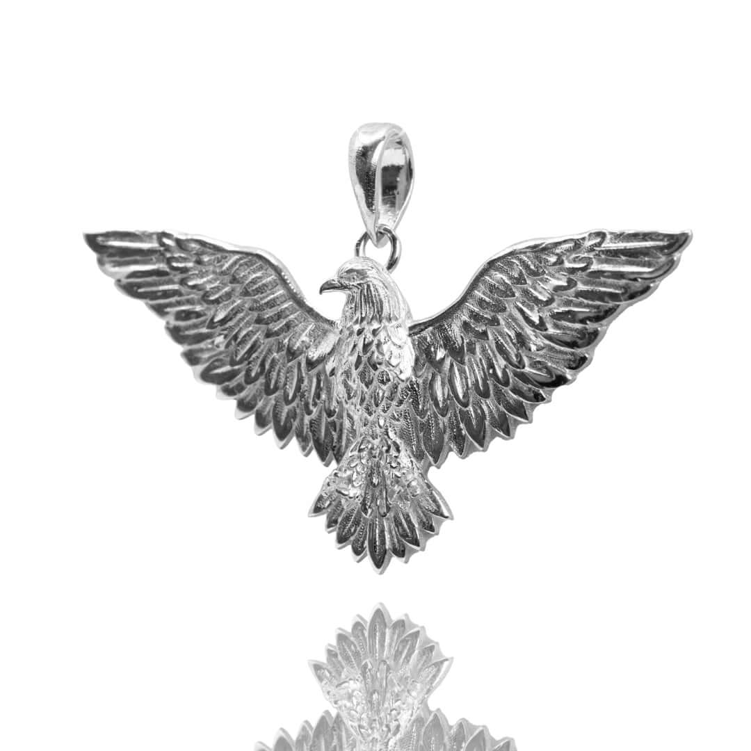 Alt="Symbolize freedom with a solid silver eagle pendant. 6g pure sterling silver, fits 3mm chains. Insured 2-day FedEx shipping. Crafted for bold spirits."