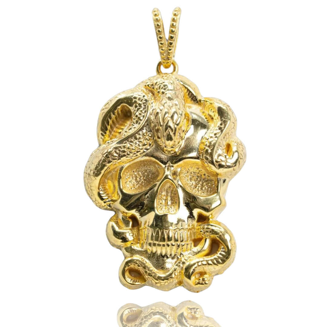 Alt="Discover the Snake Skull Pendant in 14K gold—a bold, edgy pendant for men who appreciate luxury and unique style. Perfect for making a statement."