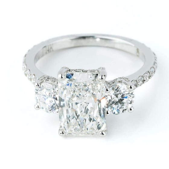 alt=" Discover the 4.84 CTW Three Stone Radiant Engagement Ring. Featuring lab-grown radiant-cut diamonds and a sleek 14K white gold band, it’s a timeless women’s ring. "