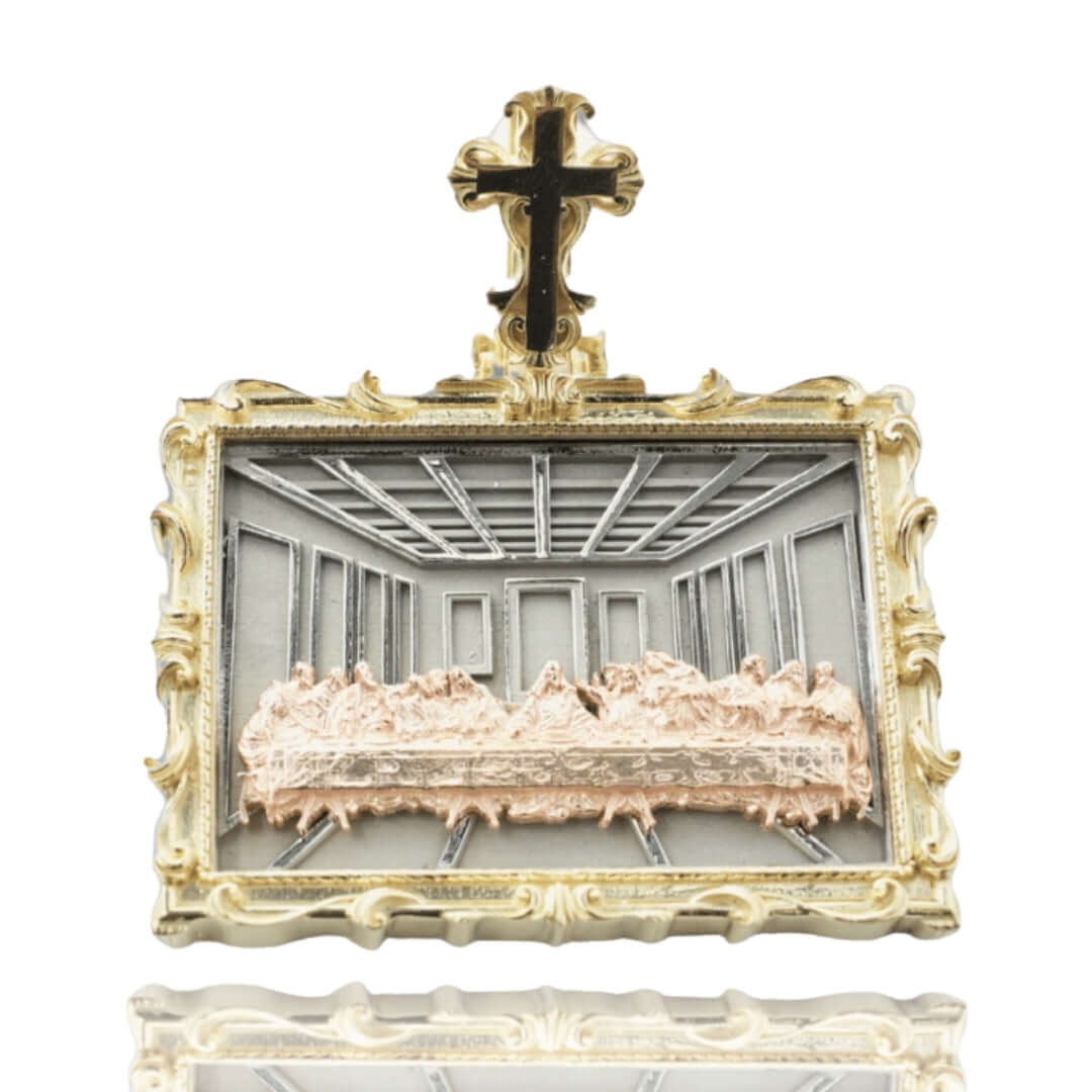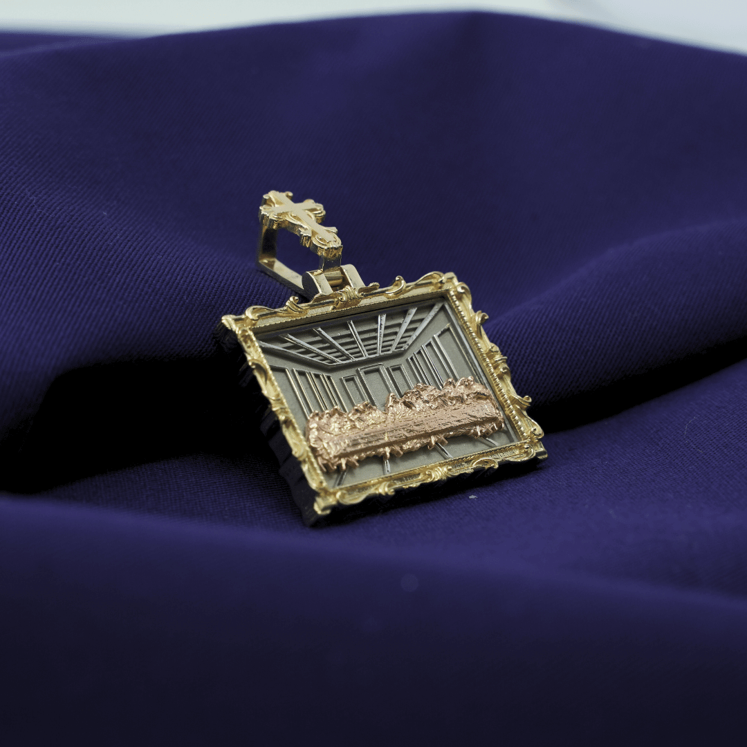 Alt="Discover the 14K Tricolor Last Supper Pendant, a masterpiece in yellow, white, and rose gold that beautifully captures art and faith."