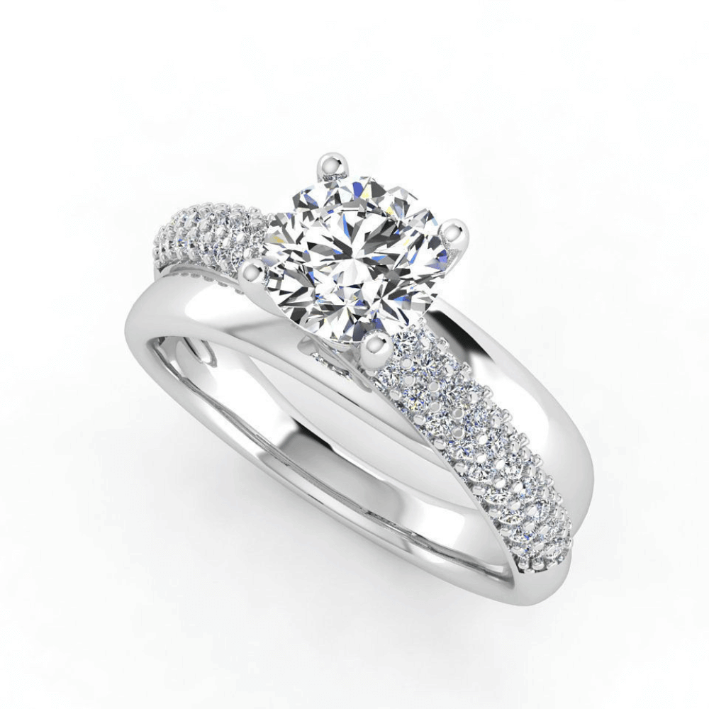 alt=" Explore the Triple Row Pavé Band Lab Diamond Engagement Ring. A luxurious women’s ring featuring a 2.00 CT round lab diamond and triple-row pavé accents in 14K gold. "
