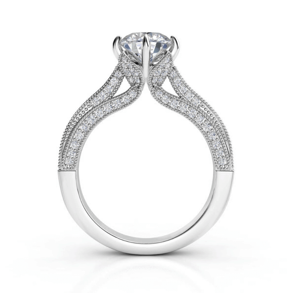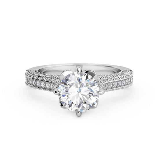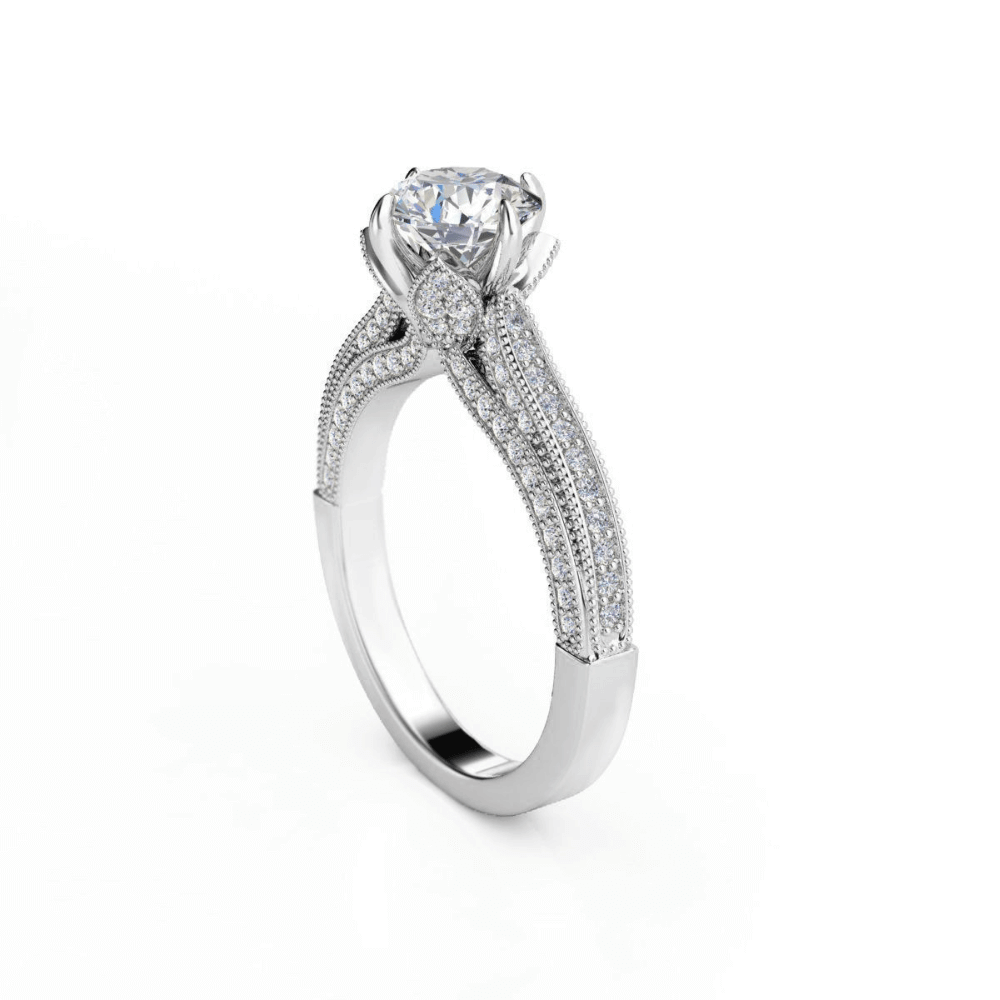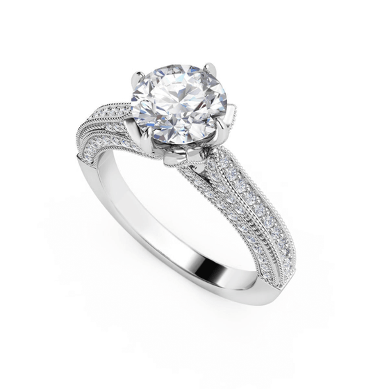 alt=" Discover the Vintage Milgrain Solitaire Lab Engagement Ring. Featuring a 1.75 CT round lab diamond with a pavé band and intricate milgrain detailing in 14K gold. "